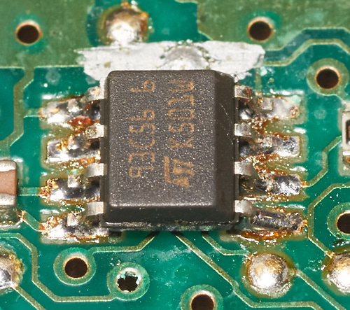 Bad solderings on a IC inside a Engine Controller for a Opel Astra Stationcar. Allmost all the soldering was like mush, a oscilloscope probe could easily lift a pin from the pad - as the one right at the right of the corner. The engine worked, but a high speeds it stopped.