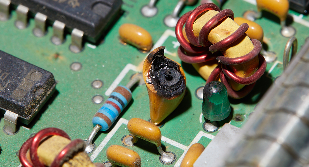 Bad SMD soldering. The capacitor was replaced with ceramic version on later models.